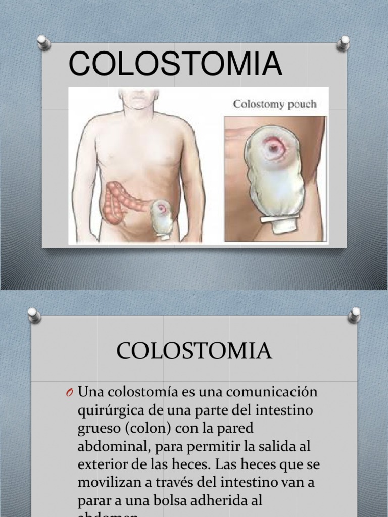 A colostomia consiste na ligação do intestino diretamente à parede do abdômen permitindo que as fezes sejam eliminadas para uma bolsa. Lintestino viene fatto passare attraverso la parete addominale e viene suturato alla pelle. Una colostomía es un tipo de estoma que permite unir el colon a la pared del abdomen como consecuencia de un acto quirúrgico para tratar por ejemplo un cáncer de colon o de anoAsí el tránsito intestinal es derivado hacia el exterior y las materias fecales pueden llegar a una prótesis específica.