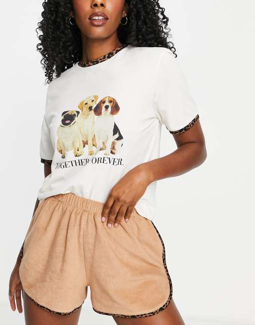 Asos Design Pyjama Aus T Shirt Mit Together Forever Hundeprint Und Frottee Shorts In Cremeweiss Und Braun Asos